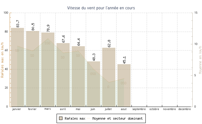| janvier | 0.2 °C | 5.0 °C | 20.9 °C | 11.7 °C | 8.3 °C | 9.7 km/h | 83.7 km/h | SO |