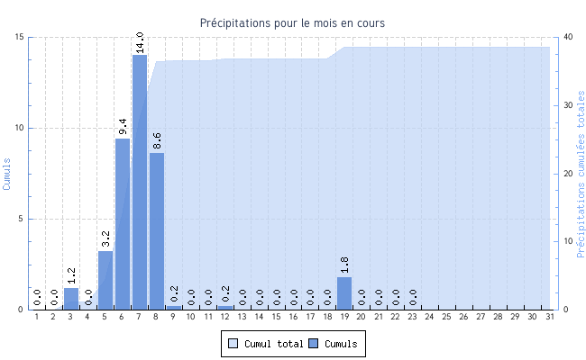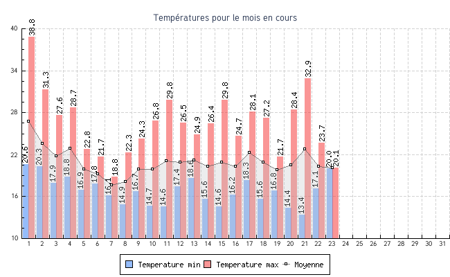 | Total | 13.4 °C | 38.8 °C | 20.9 °C | 4.5 km/h (45.1 km/h) | SO |