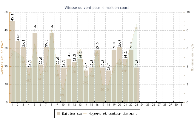 | min | max | moy | Vitesse (rafales) | Secteur | ||